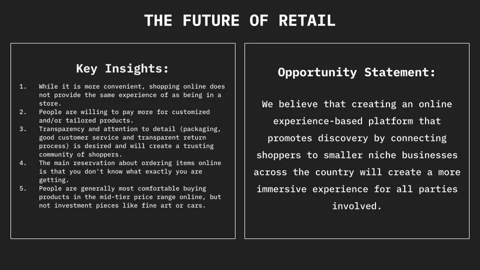 The second project we’ve had to complete online was a research project designed with the user in mind. For this project, my team had to research the future of retail to fond gaps that could be filled. To collect this data, we surveyed almost 40 people and interviewed 6. Out of those 6 interviews, one was a gallery owner and one was a local store in NYC called Cafe Forgot.
